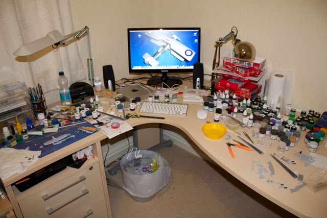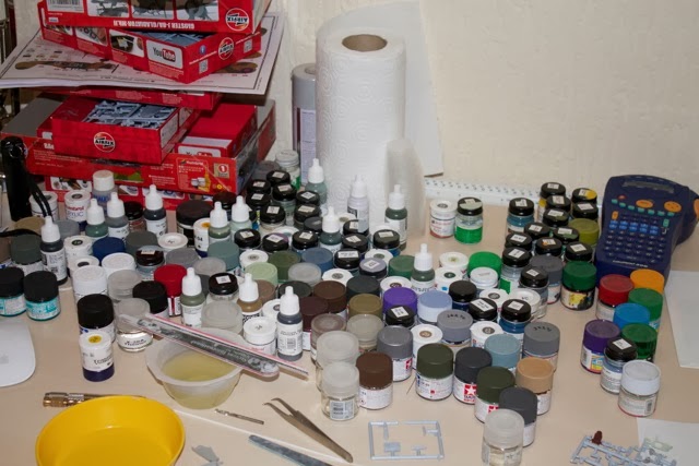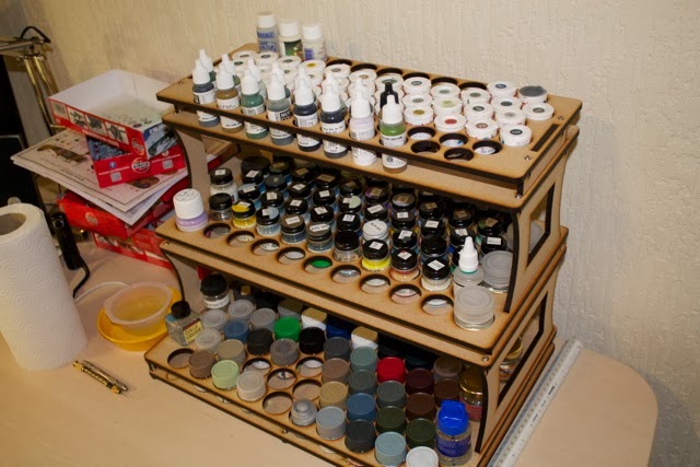 So I counted my Tamiya (large and small), Humbrol, Vallejo, ModelMaster and Gunze jars and sent him the quantities. I also stated height was not an issue but I wanted it to fit within about 12 x 18 inches (+1 inch each way if needed).