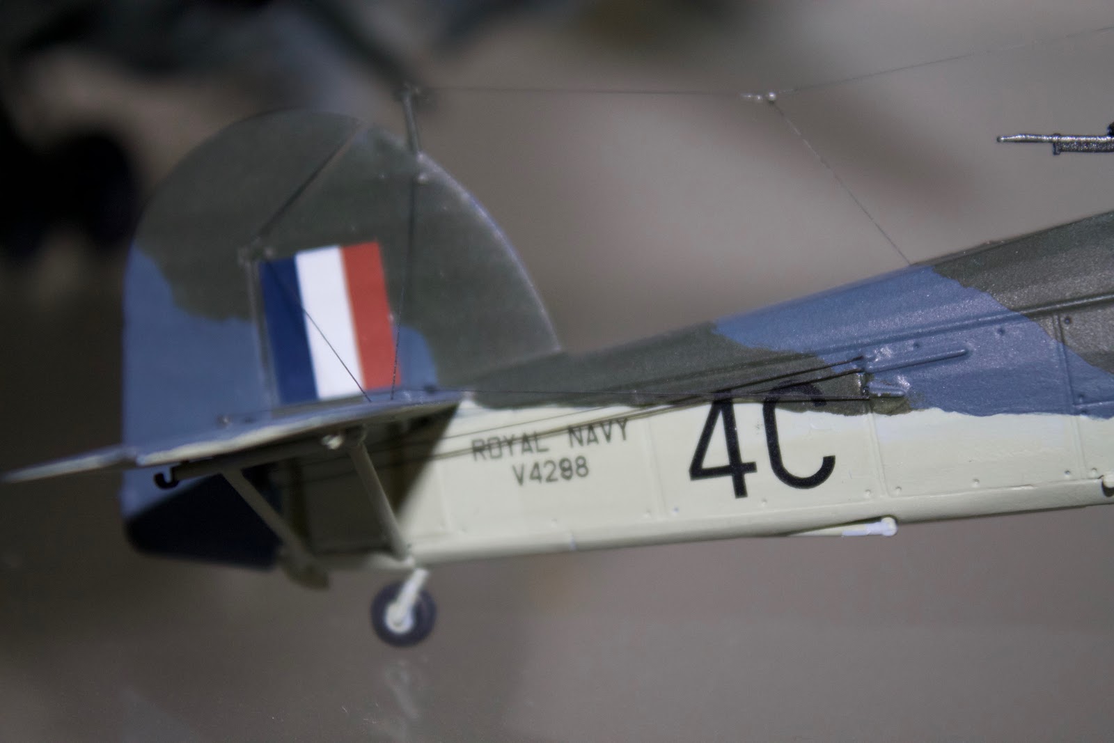 With rare exception, my aircraft models are all 1/72nd scale. I use all three thread diameters. The largest (.03mm) I use for inter-plane flying and landing wires. I apply it by planning my rigging before I build. Well before the paint stage I determine exactly where each flying or landing wire is attached to the wings / fuselage and then drill a .05 mm hole using a drill in a pin vise. I generally don’t go all the way through the plastic, but sometimes it makes sense to do that. On the Airfix Swordfish the wings are thick enough for an upper and lower half, so I certainly drilled all the way through on the bottom wing upper surface, and the top wing lower surface. I also drill at an angle that approximates the angle of the wire as it exists the structure.