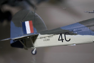 The medium diameter thread (.02mm) I use for control wires. For the Swordfish I first glued the end in the fuselage, where it exits, in the same manner as the lower wing for the flying wires. The next step is to put a drop of glue on the guide pulley (not all models have these, but the Swordfish did) on the tail plane. Some times these are big enough to allow a drill bit to go all the way through, which actually makes for a more realistic look than having it glued on. The final step is to pull it in tension to the control horn on the rudder/elevator/aileron and attach with superglue. Again, I use accelerator on the thread.